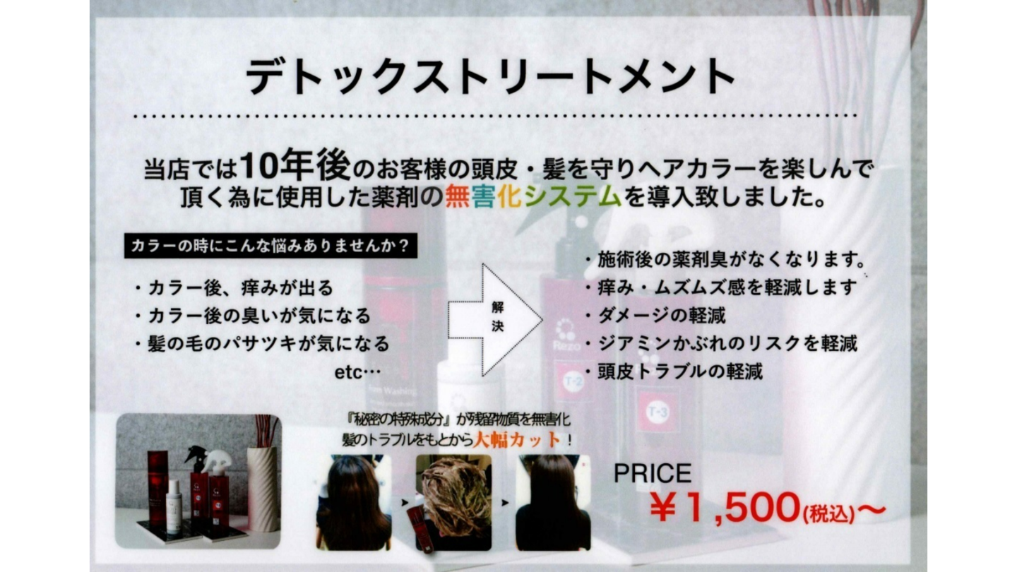 REZO システム 刺激・残留薬剤・残臭を最小限に 頭皮に染みないカラーパーマ 頭皮に対する刺激が約60~90%減少!髪が傷まないカラーパーマ 毛髪の残留薬剤が約70%減少!臭いが残らないカラーパーマ 毛髪に対する薬剤の残臭が約90%減少!